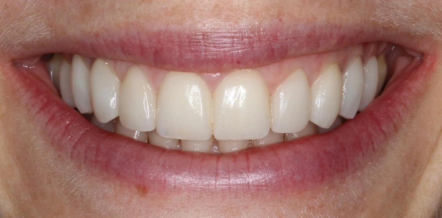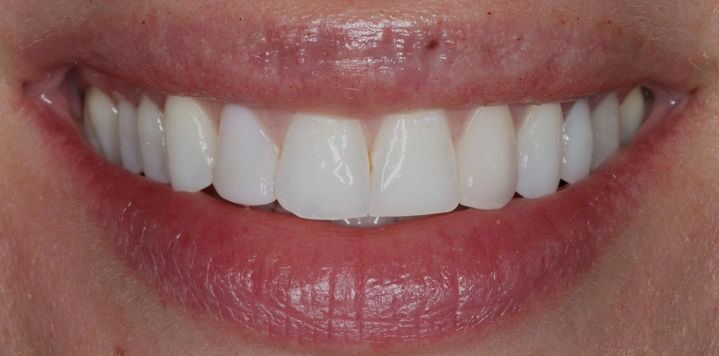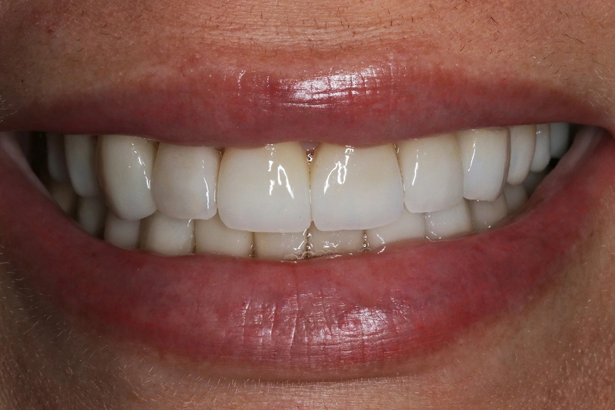 • The goal was to gently move the canine teeth forward by reshaping the outer tips a bit. This helped close the gap between the teeth, and we used custom-made porcelain veneers on the front teeth to create a natural, even smile