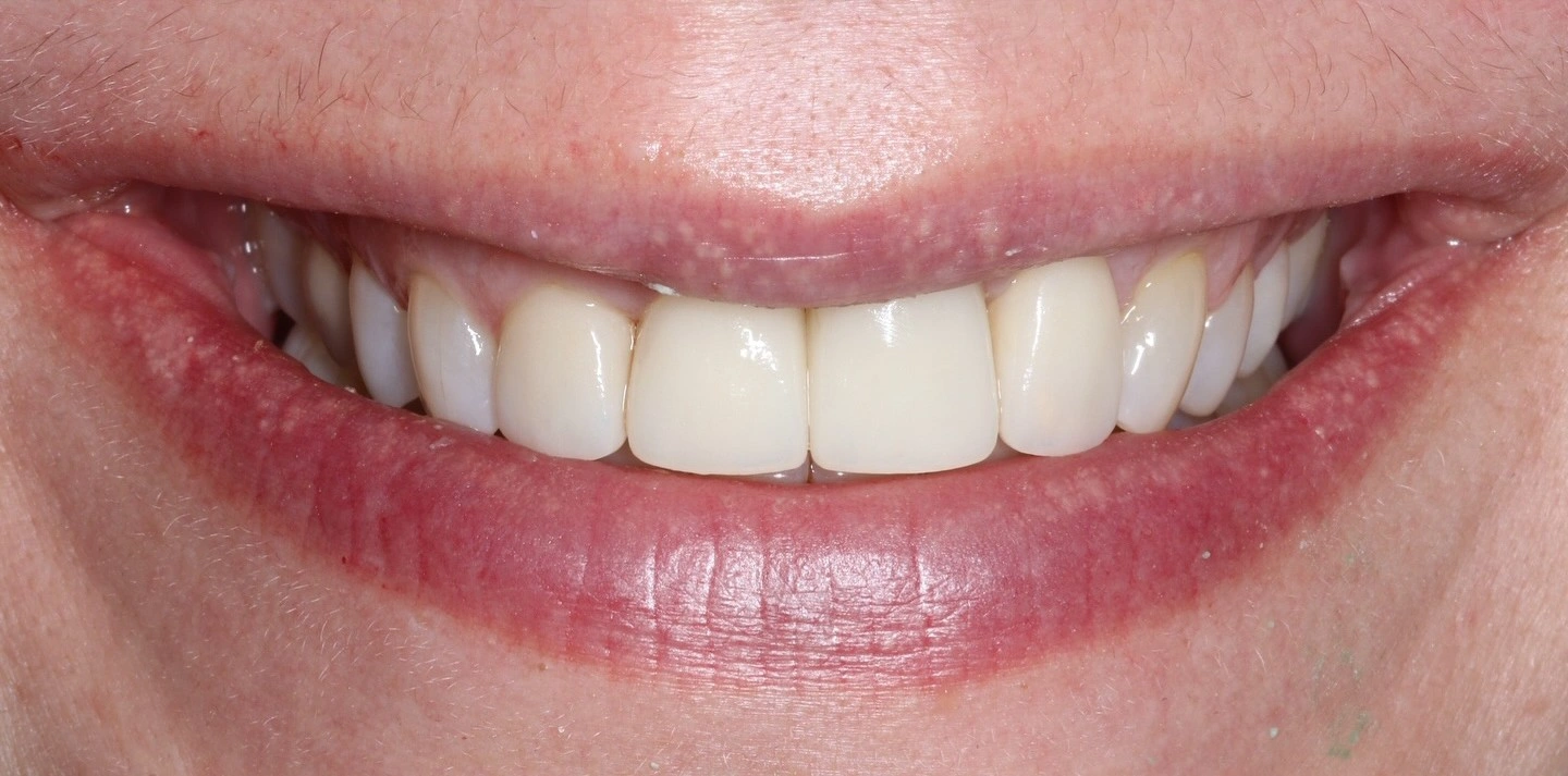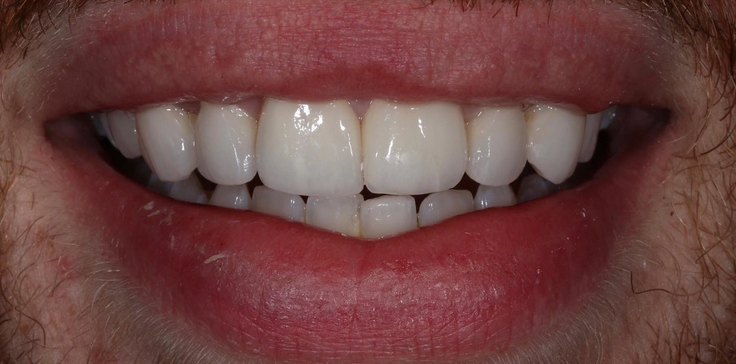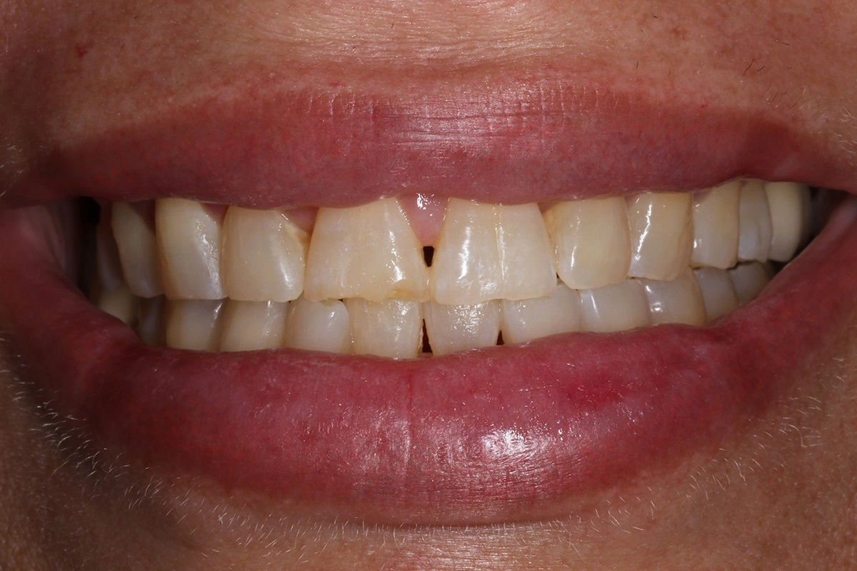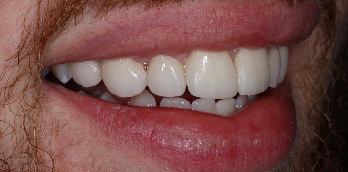 • The goal was to gently move the canine teeth forward by reshaping the outer tips a bit. This helped close the gap between the teeth, and we used custom-made porcelain veneers on the front teeth to create a natural, even smile